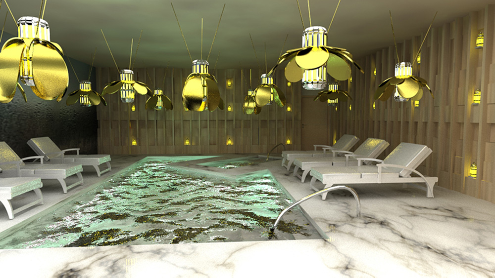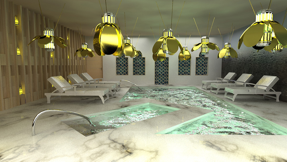 Custom chandeliers inspired by the national flower of Dubai designed for the Spa in the Hotel Apartment Project, Residential City, Dubai World Central.