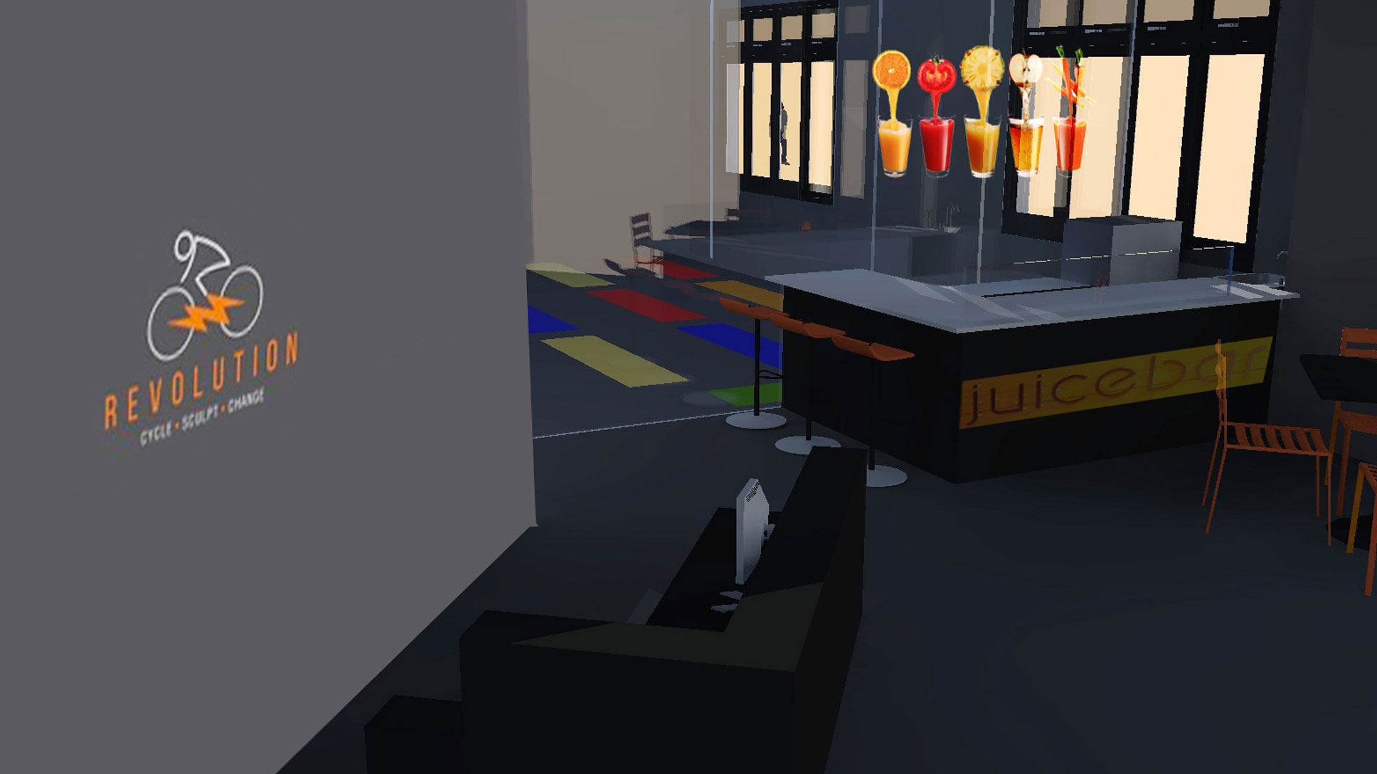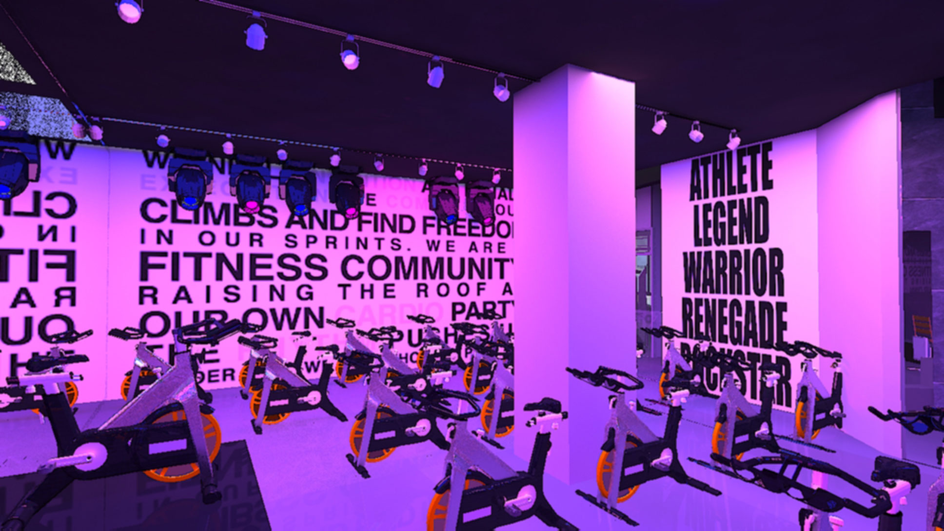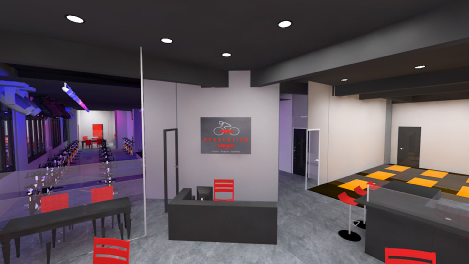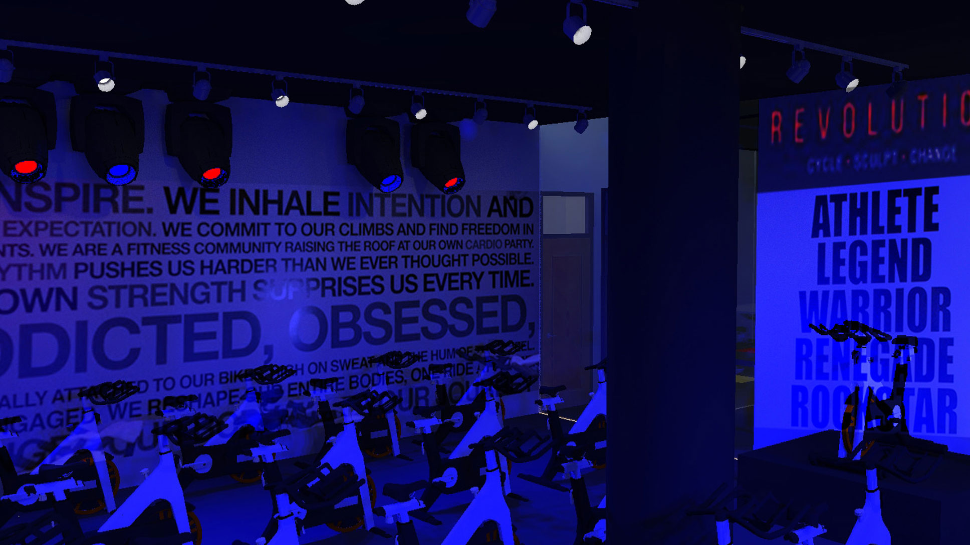 A contemporary indoor cycling and sculpting studio. The studio emphasizes clean lines for a pure aesthetic. In addition to a custom solid surface reception desk, juice bar in the reception lobby and custom locker rooms, the space is acoustically treated to sound proof the spinning studio where high energy music is played complete with strobe lights.